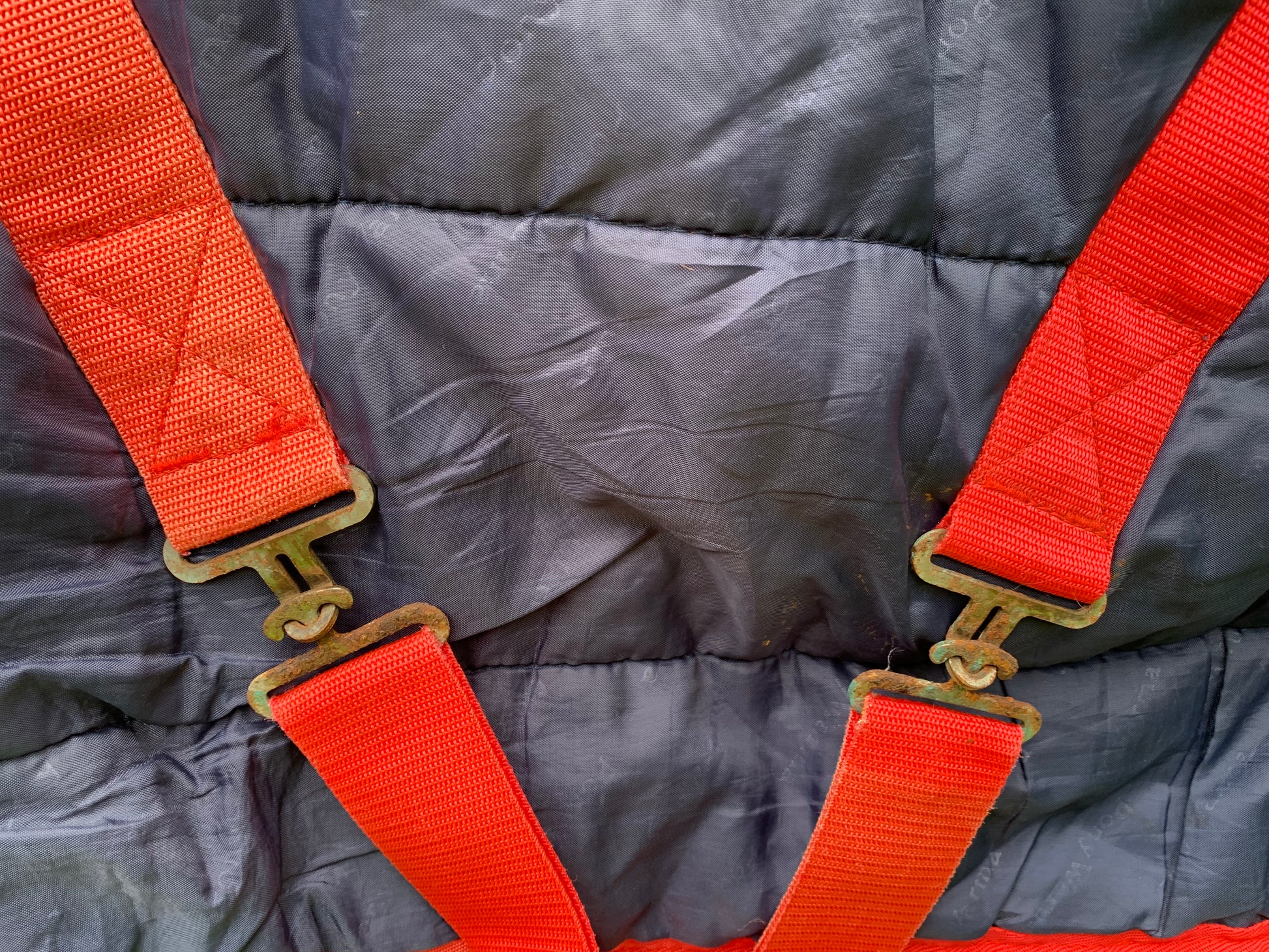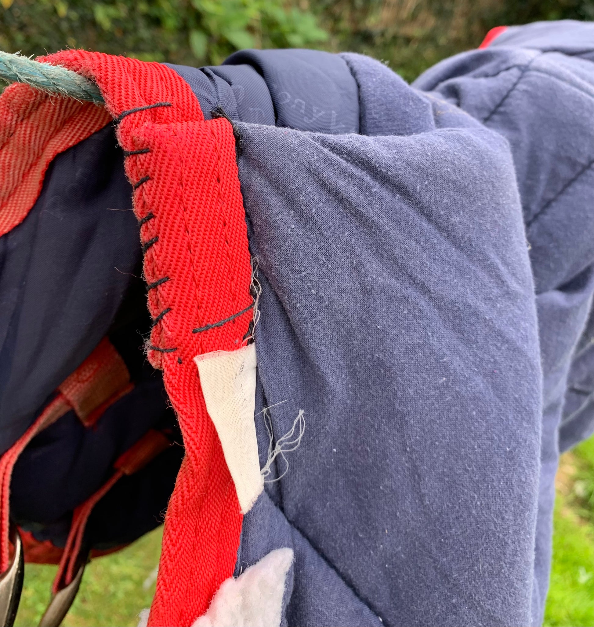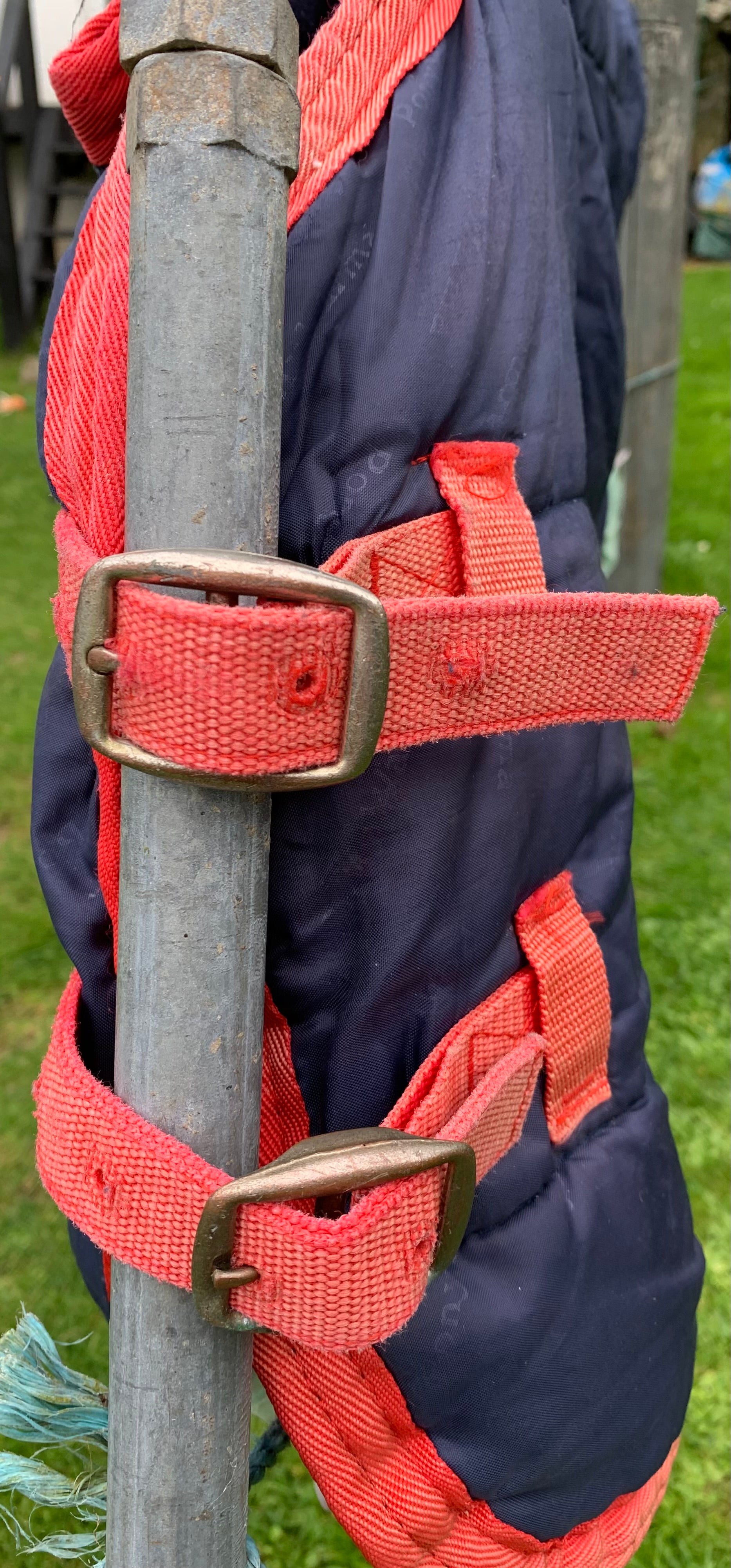 Has been hand stitched to make the neck opening narrower, could be unpicked or kept as it is. Some rust to buckles and a mark on the inside