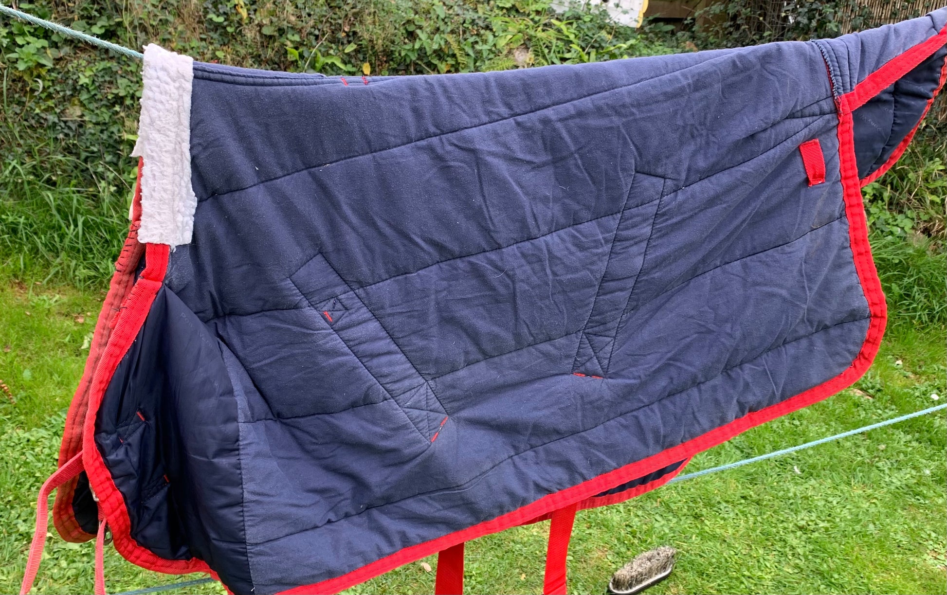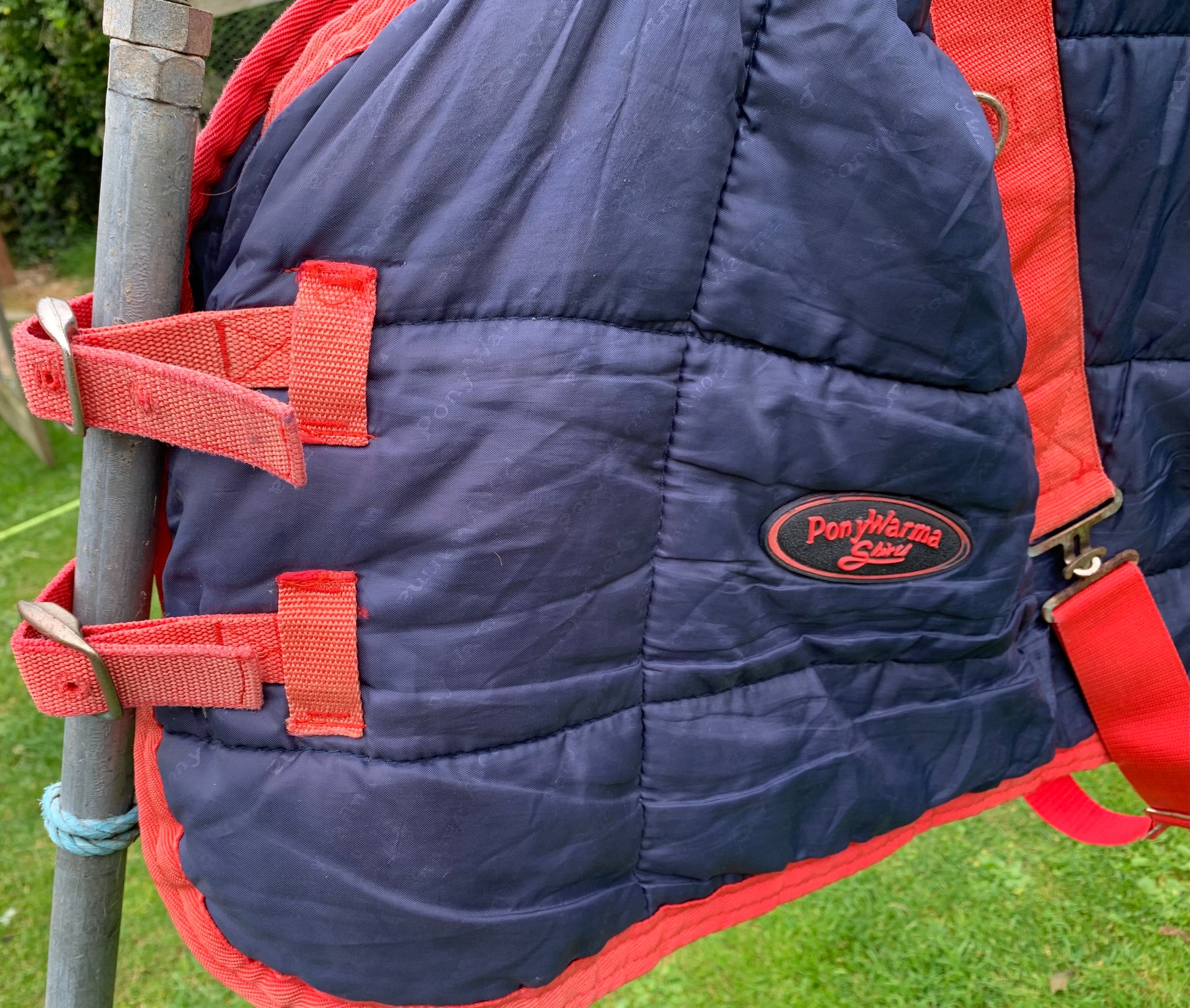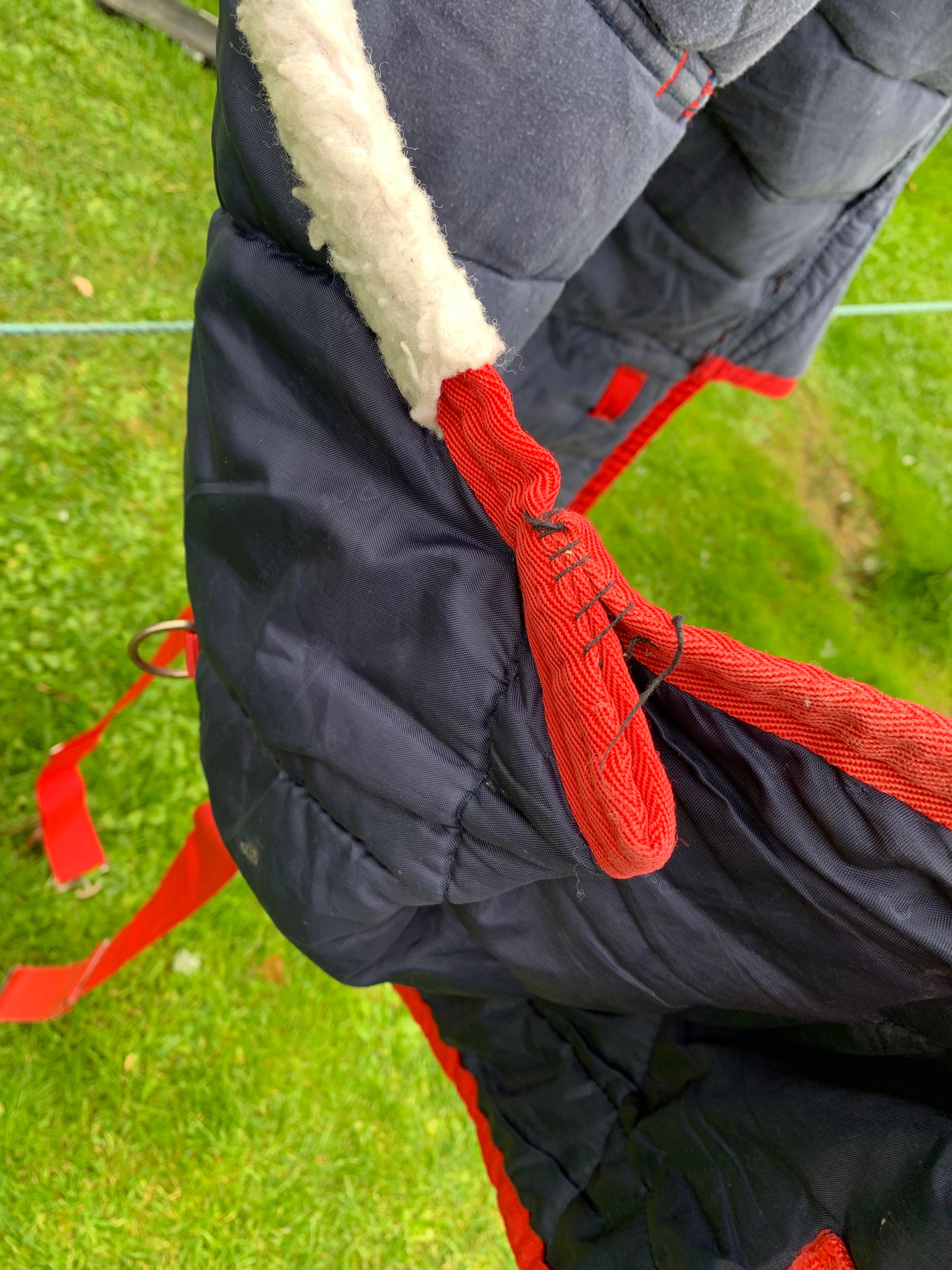 Has been hand stitched to make the neck opening narrower, could be unpicked or kept as it is. Some rust to buckles and a mark on the inside