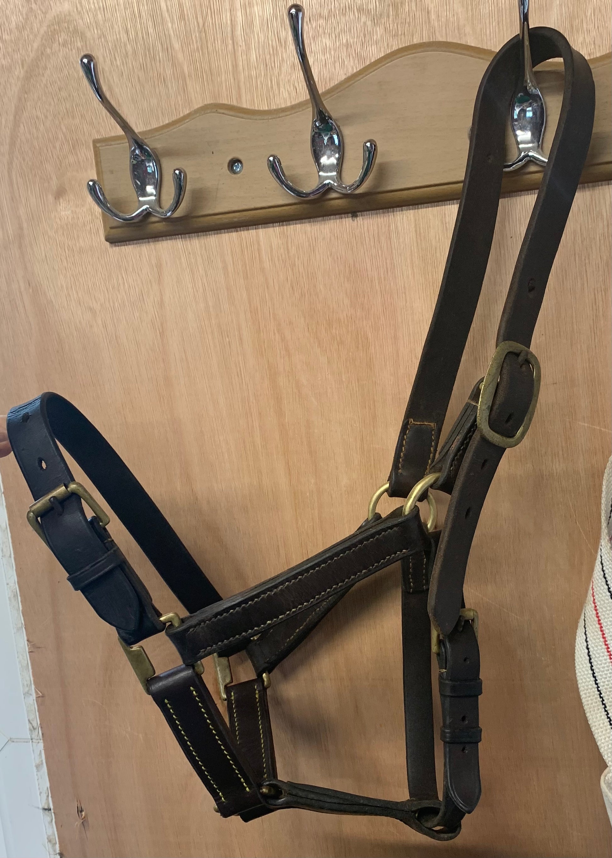 Brown large pony/cob leather headcollar with brass fittings. Has a couple of extra holes punched (see photos)
