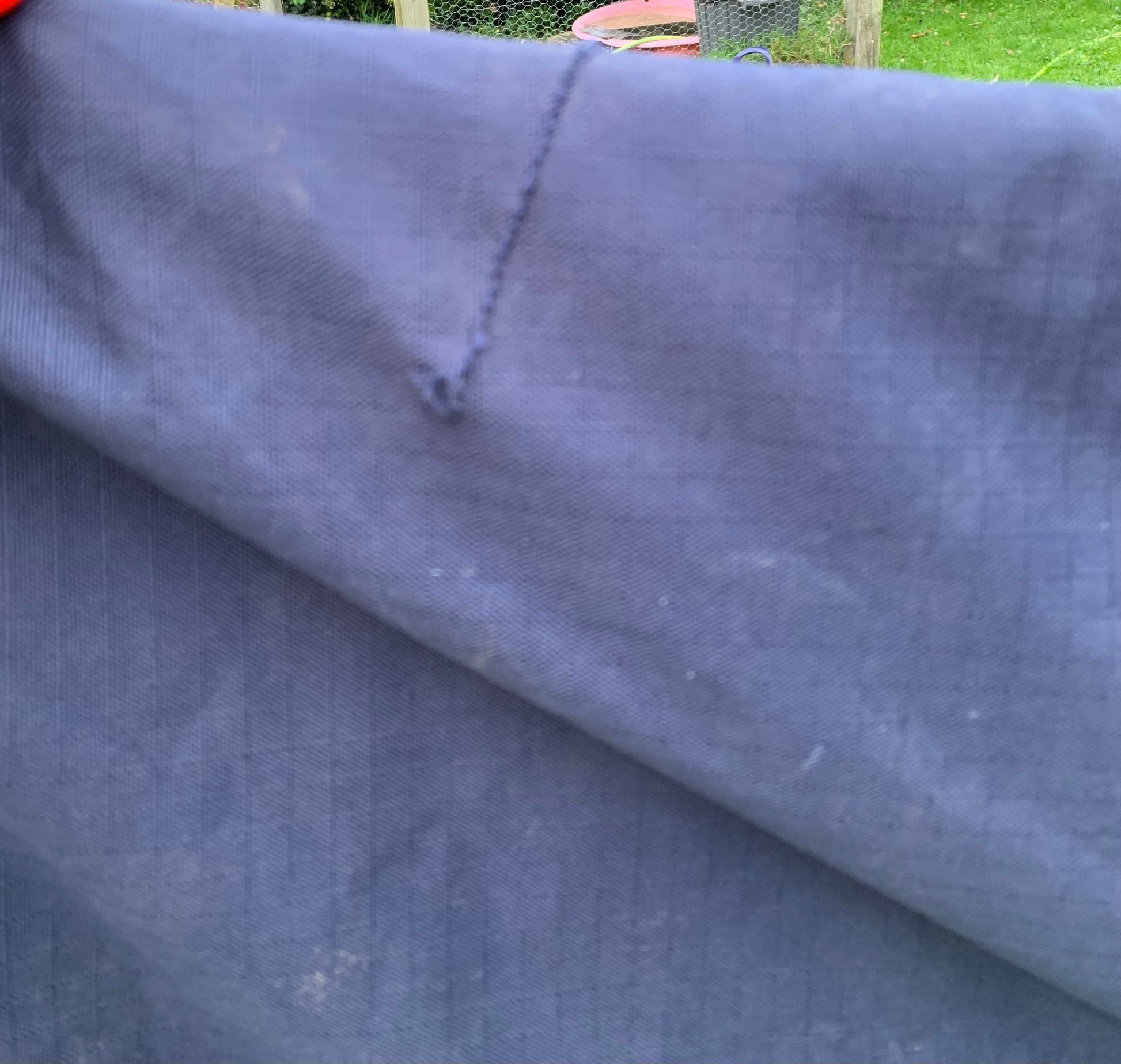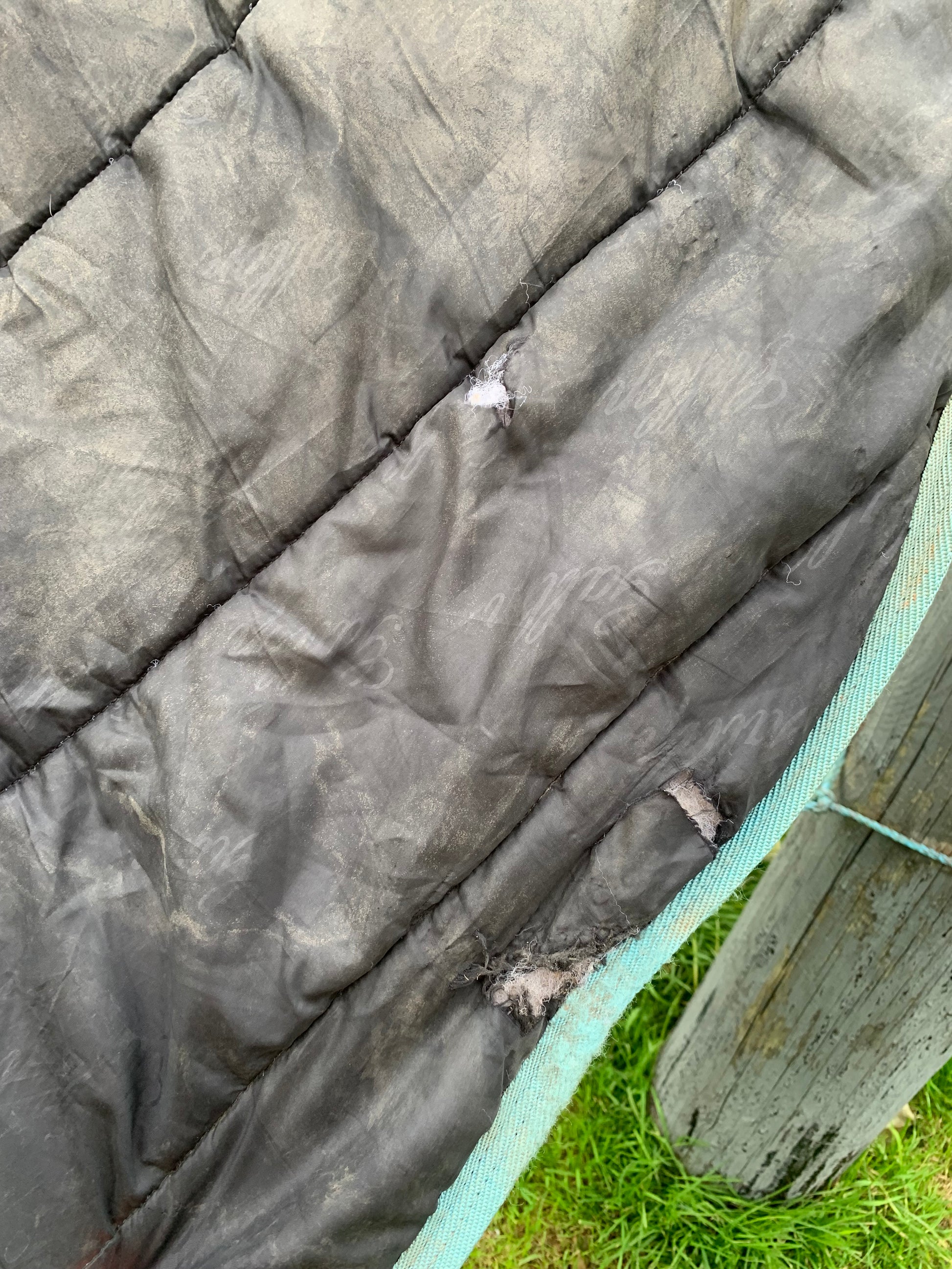 Has a couple small rips (see photos) still feels waterproof, hasn’t been cleaned