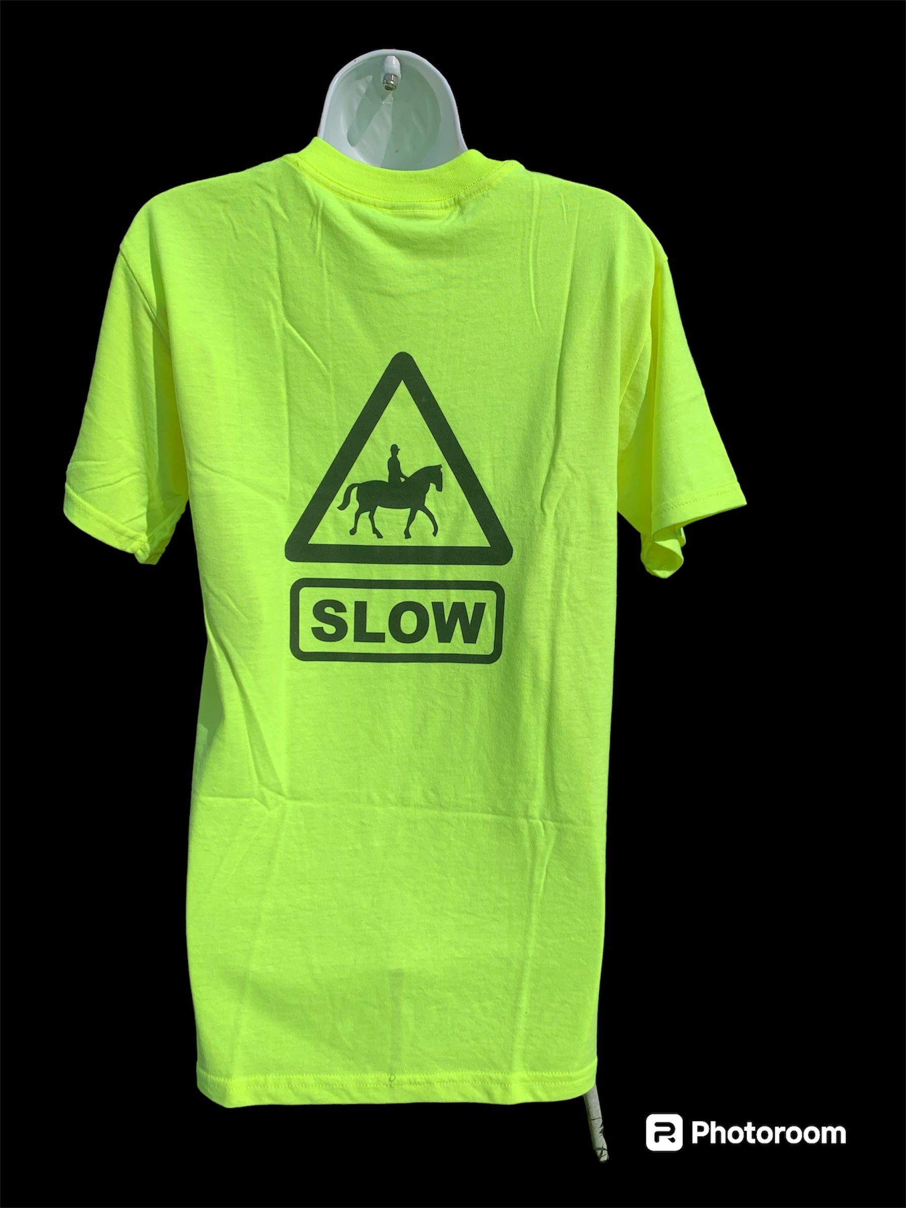 NEW Perfect for spring/summer whilst out riding on the roads “Slow”yellow t shirt. Size small but generous, can fit a 10/small 12 depending on your measurements.