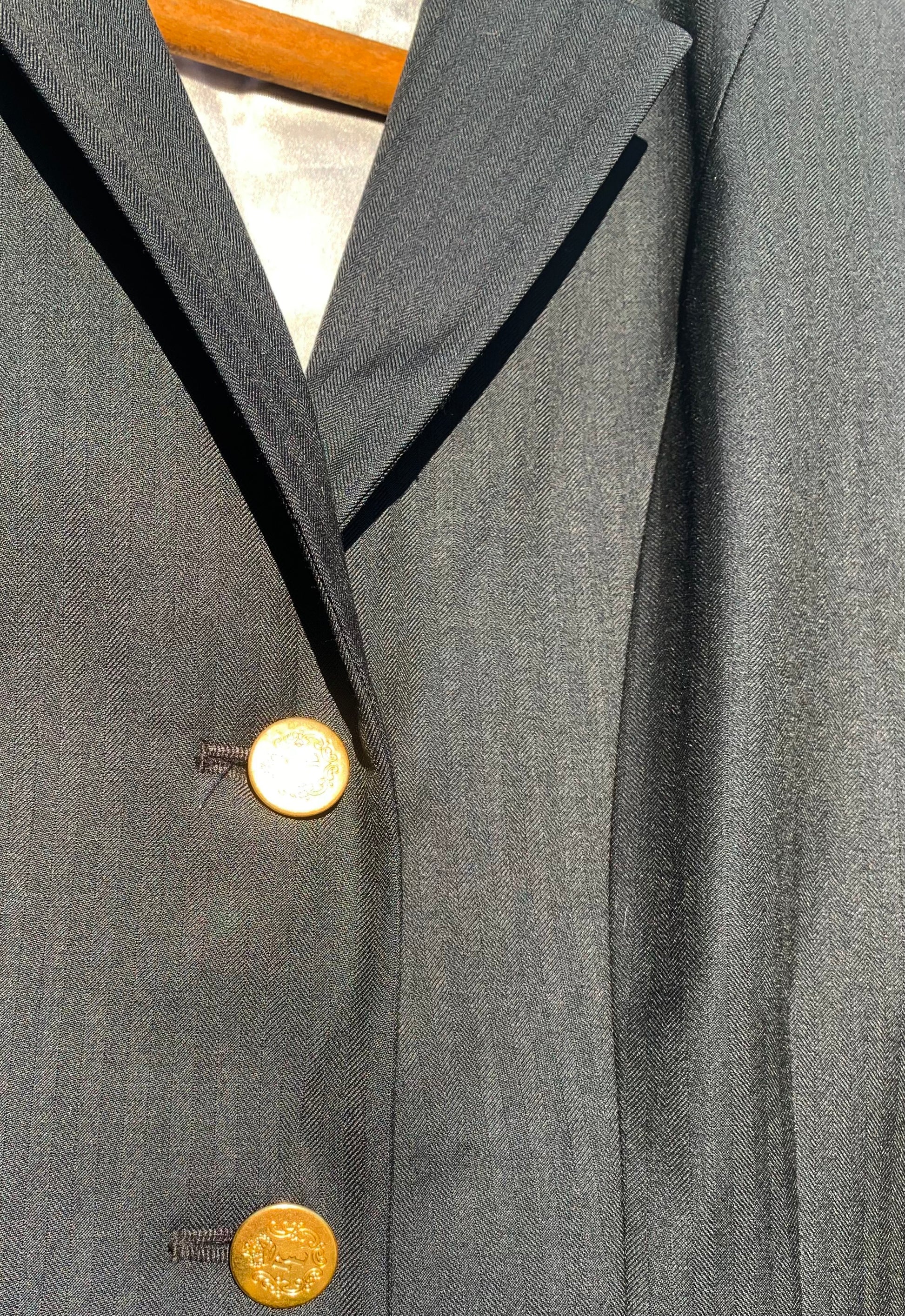 Kingsland Navy show jacket with a subtle herringbone effect to it. Silver satin lining and velvet collar. Size M measurements are: 18” pit to pit 29” in length |