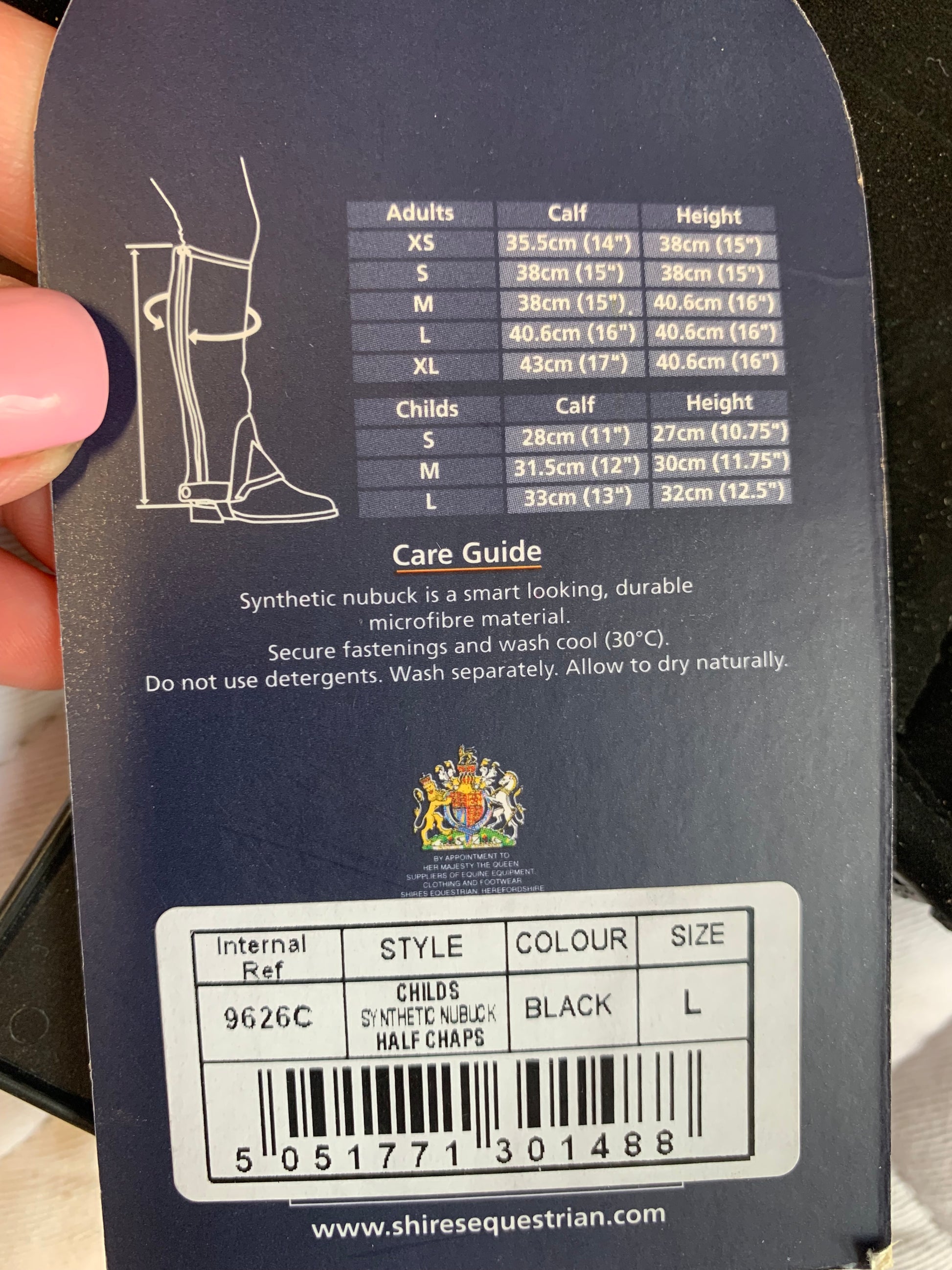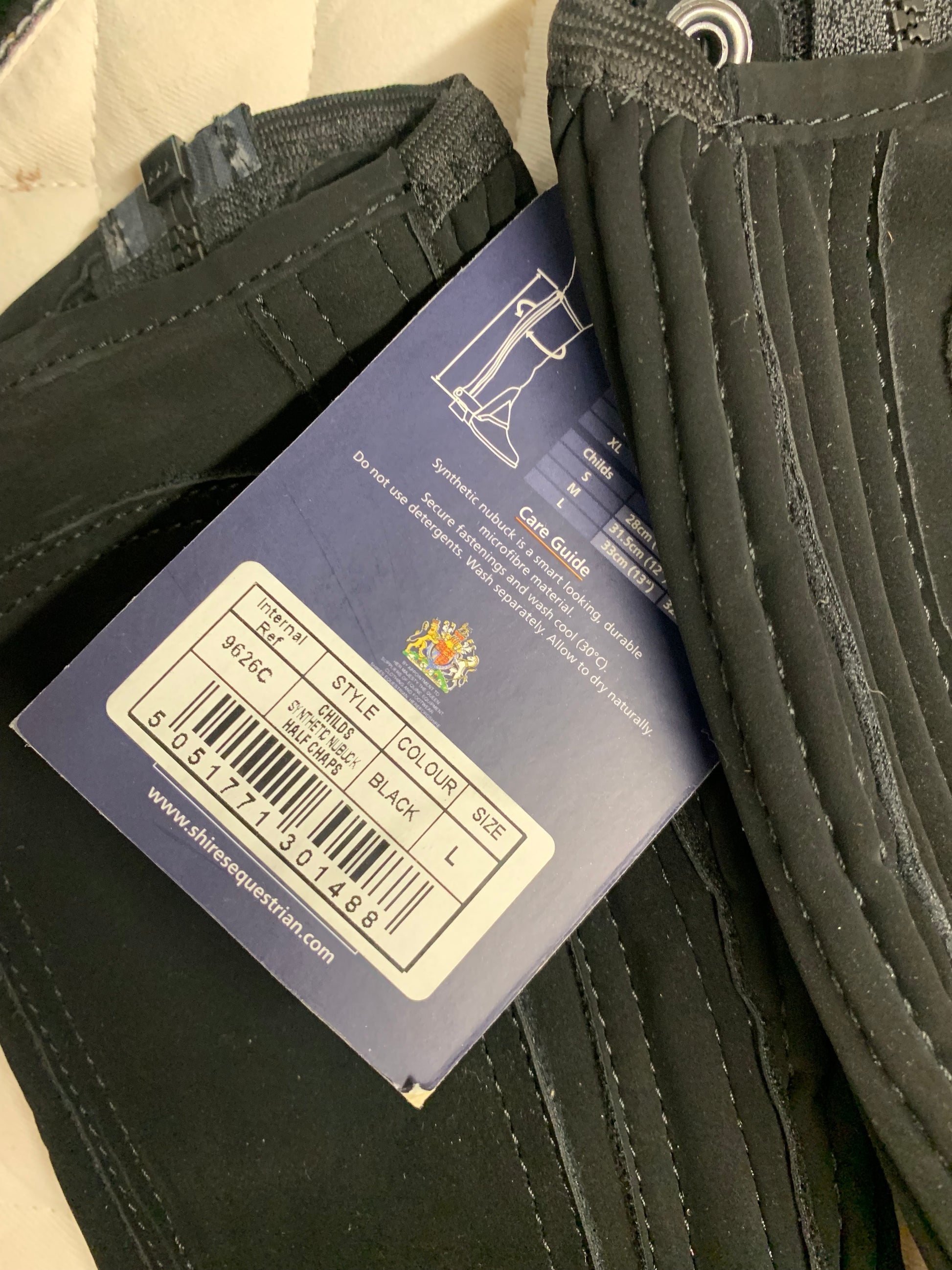 New with tag Shires Childrens Synthetic Nubuck Half Chaps - black size large