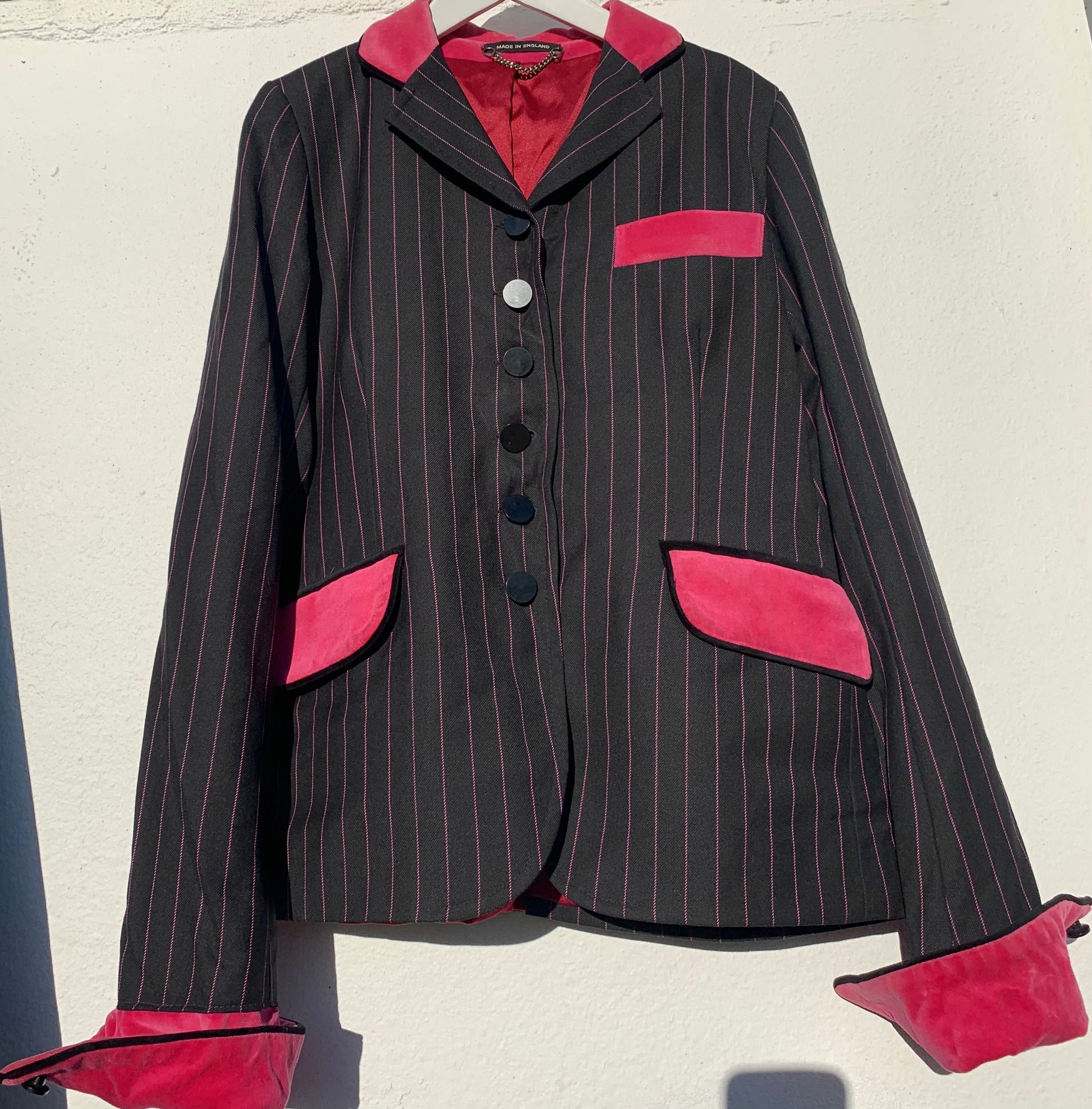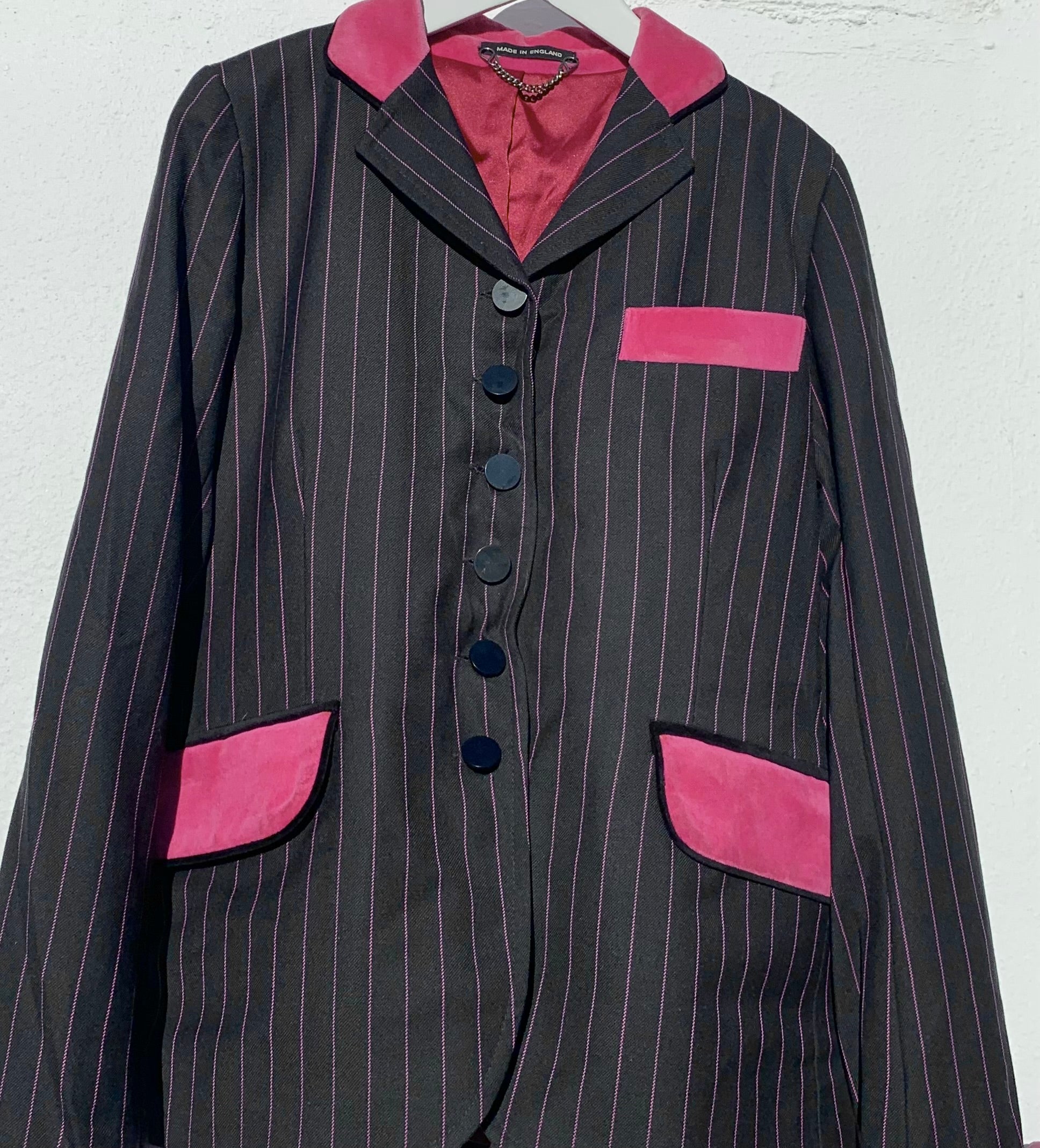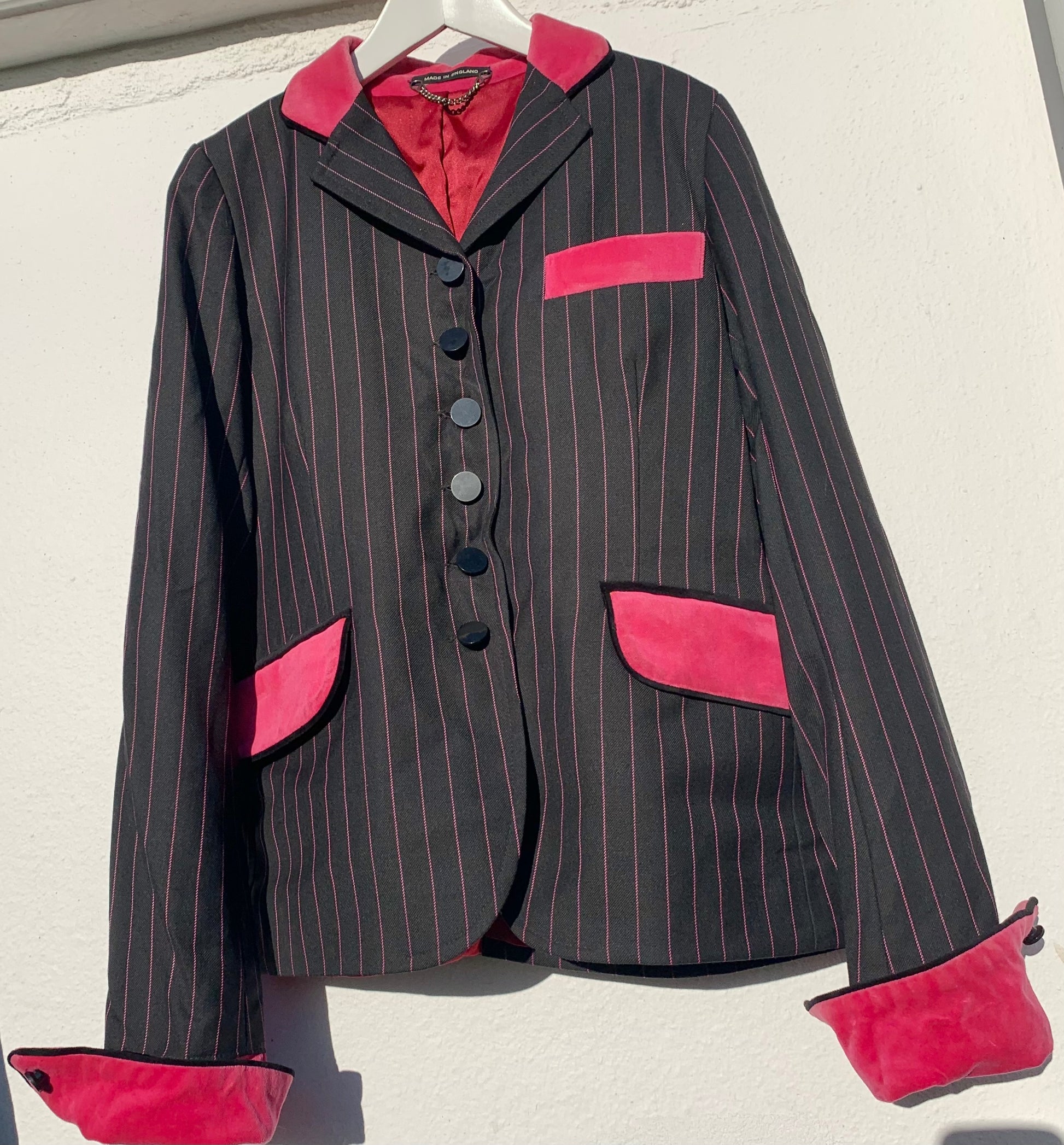 Rare le beau cheval black pinstripe jacket with velvet pink collar, cuffs and pockets.