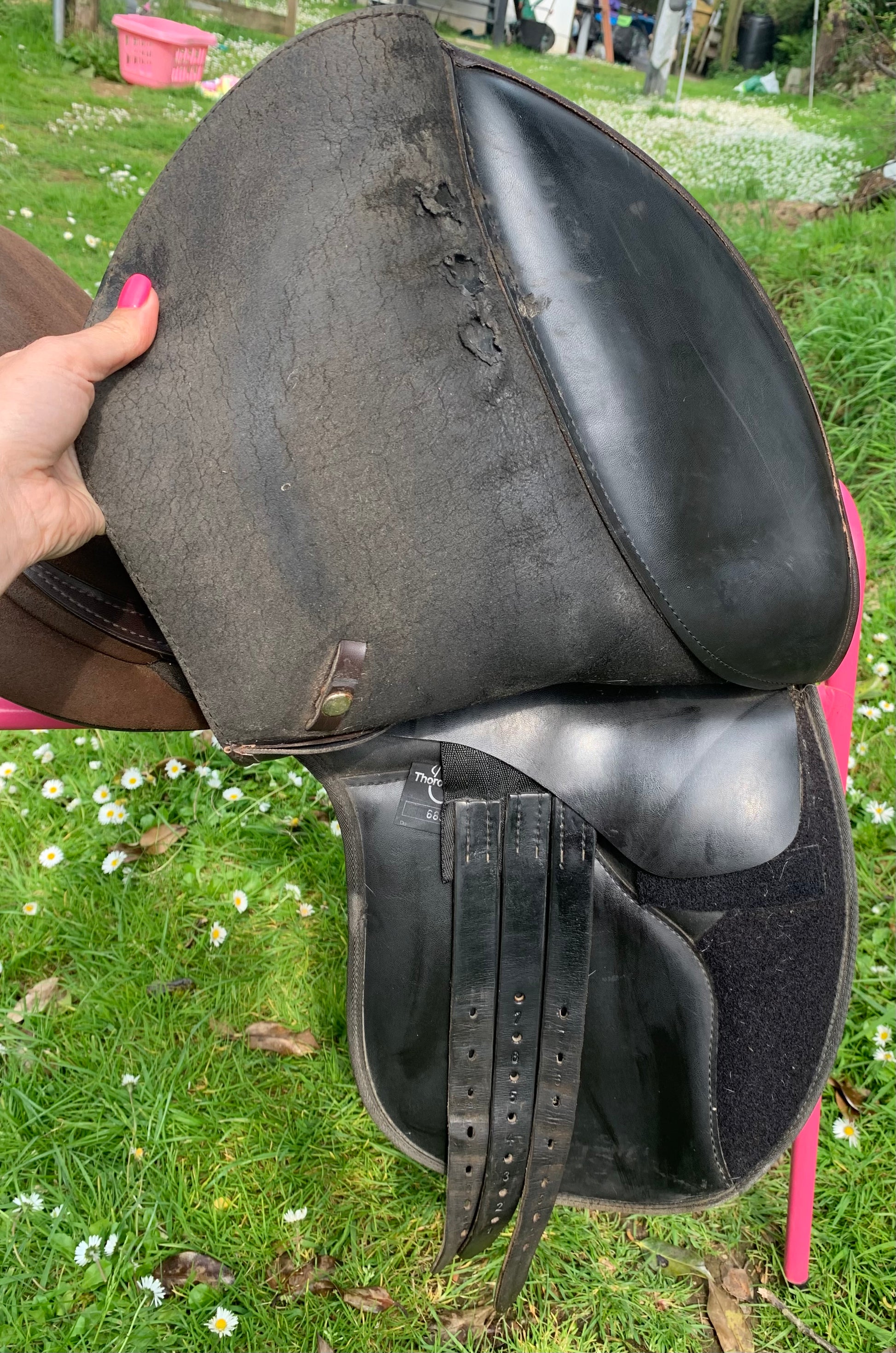 its in good useable condition but does have some damage underneath the flaps (see photos) and some fading to the suede as well as a few age related marks. Girth straps in good order.